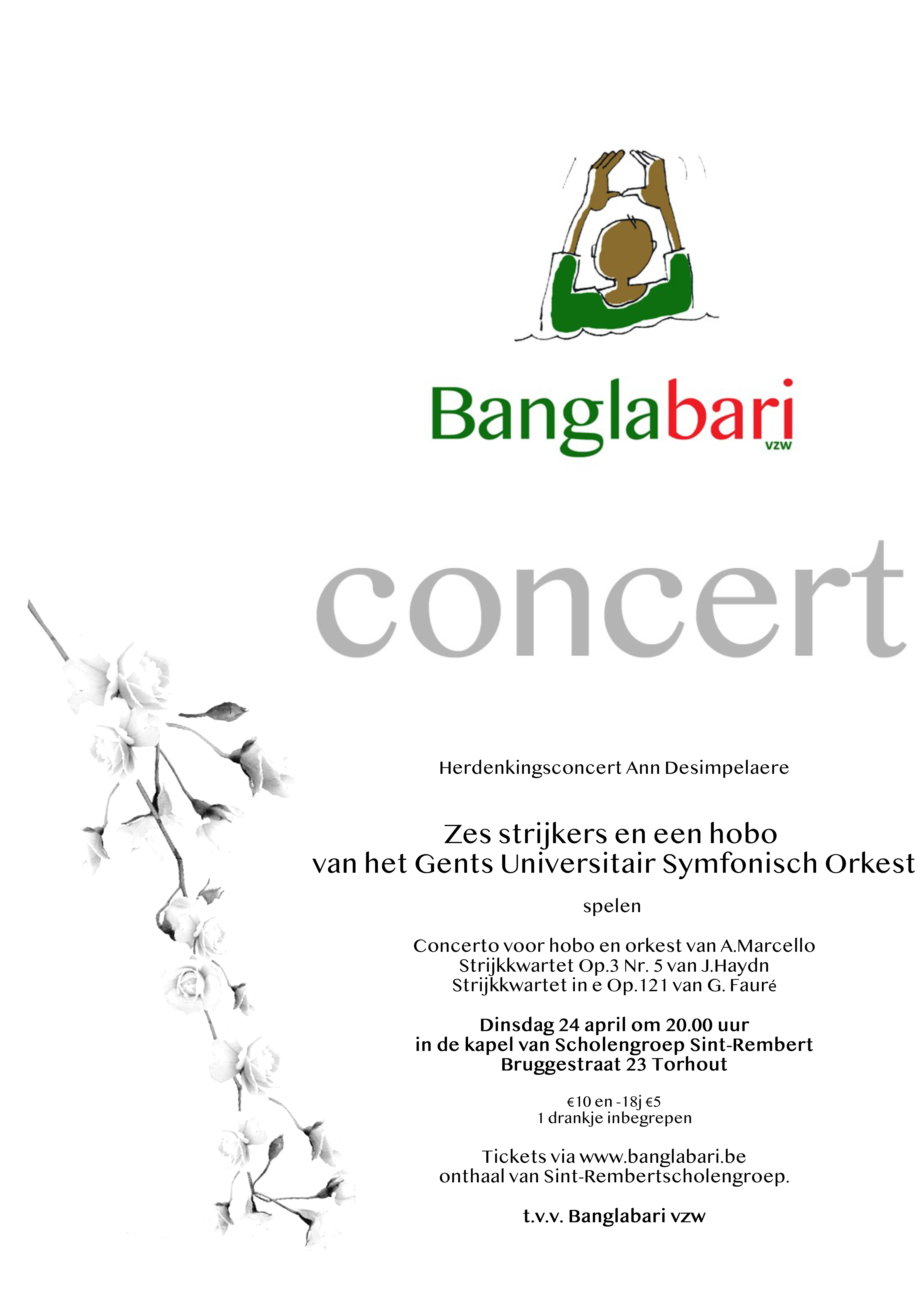 Op dinsdag 24 april organiseert Pieterjan De Pauw samen met vrienden muzikanten van het Gents Universitair Symfonisch Orkest een benefietconcert. Ze brengen het concerto voor hobo en orkest van Marcello, het strijkkwartet op.3 nr.5 van Haydn en het strijkkwartet in E Op. 121 van Fauré. Om 20u in de kapel van Scholengroep Sint-Rembert. Van harte welkom! De opbrengst gaat integraal naar Banglabari vzw.