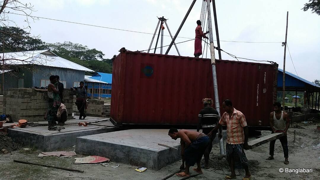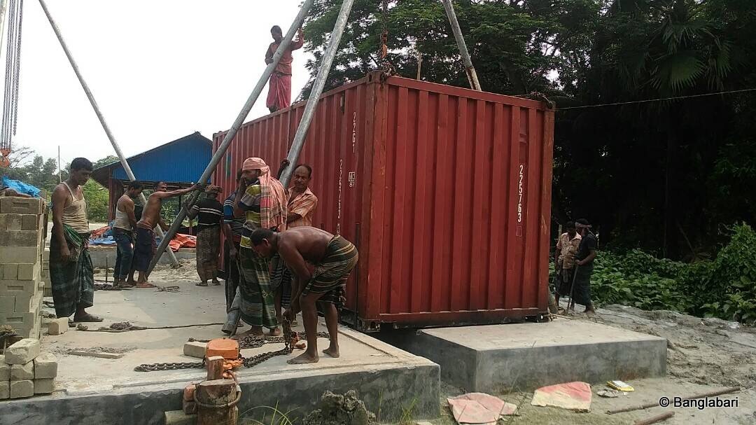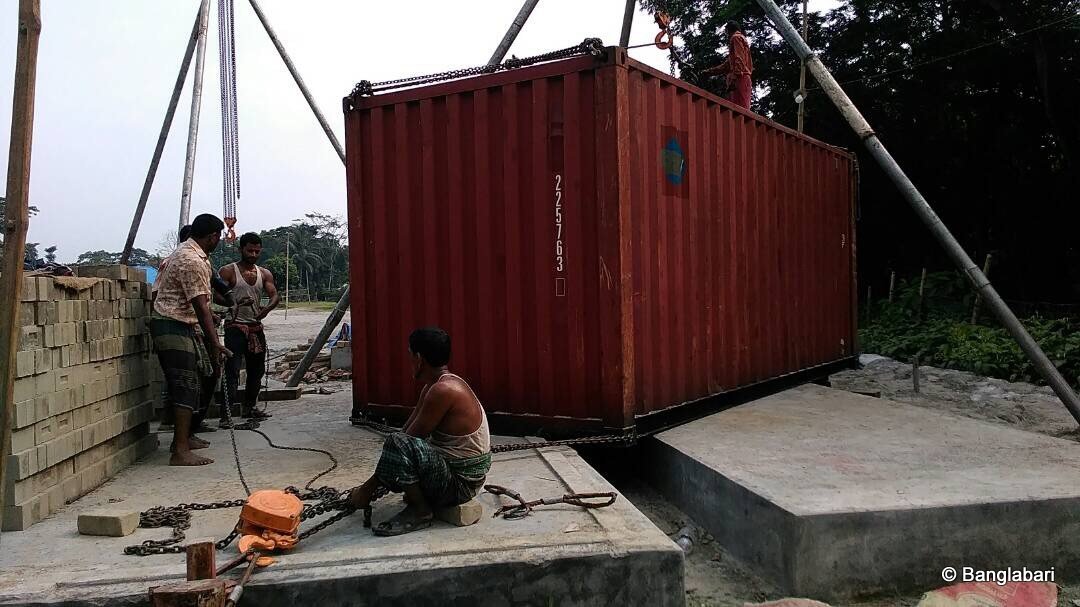 De container met de persmachine om ecologische bouwblokken te maken is net aangekomen in Shariatpur. Met veel mankracht (!) werd deze op haar plaats gezet. De start van een innovatieve bouwtechniek die mee zorgt voor een gezondere leefomgeving. We zijn dankbaar en trots…