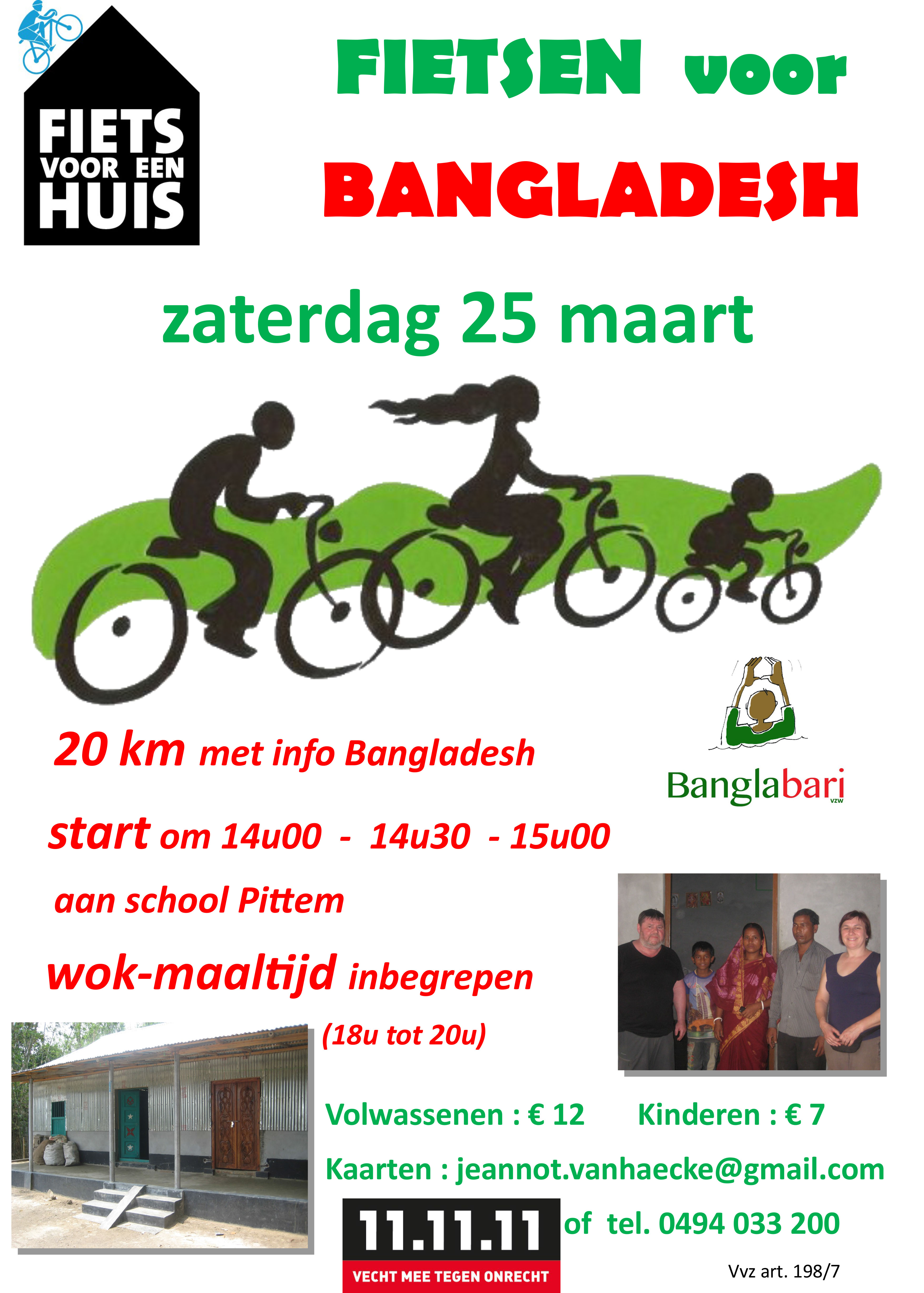 Vorig jaar gingen Jeannot Vanhaecke en Katrien Naert mee op fietsinleefreis naar Bangladesh. Op zaterdag 25 maart organiseren ze een fietstocht in Pittem met onderweg regelmatig verhaal van hun reis en de projecten die ze bezochten. ‘s avonds sluit je af met een heerlijke wokmaaltijd. Van harte welkom!