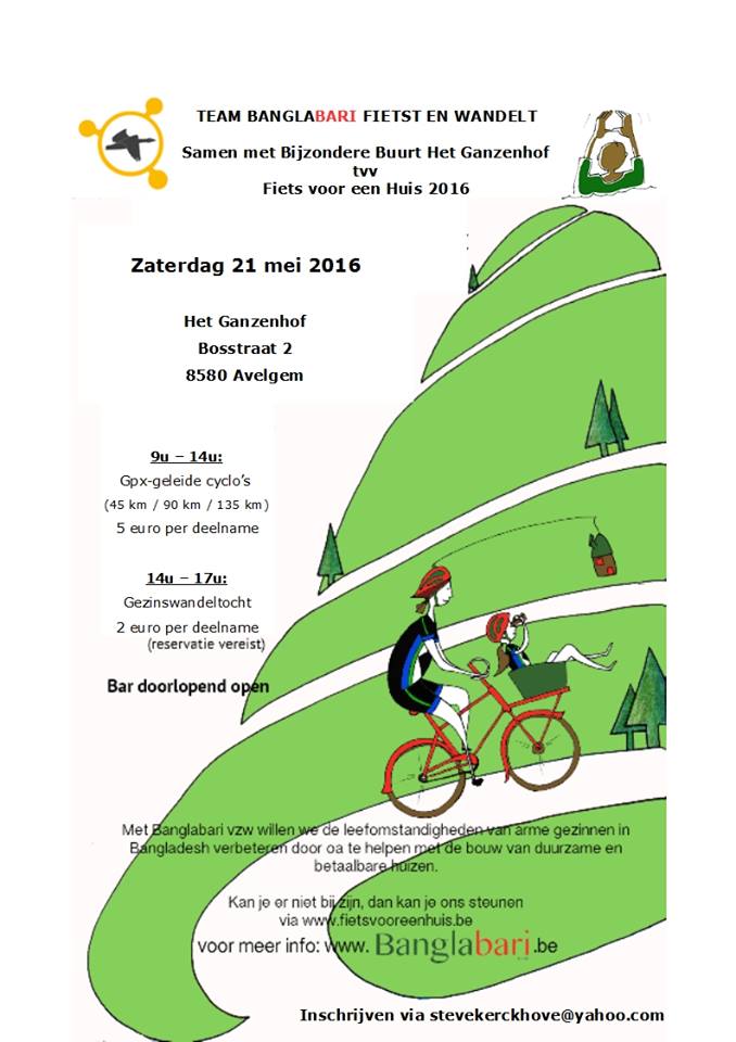 Team Banglabari fietst en wandelt op zaterdag 21 mei, samen met Bijzondere Buurt Het Ganzenhof, ten voordele van “Fiets voor een huis 2016”. Van harte welkom om deel te nemen, voor elk wat wils…